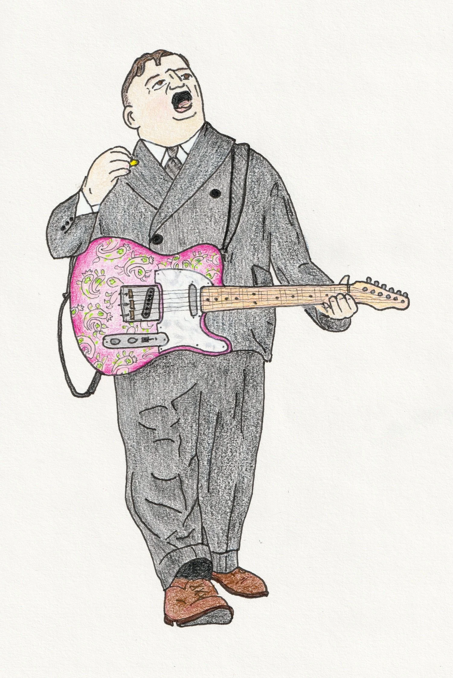 Quinn Raymond asked me to draw something for his zine, to accompany the lyrics for his song “NYC Mayors.” I drew mayor Fiorello La Guardia playing a pretty bitchin’ pink paisley Telecaster guitar. La Guardia’s nickname was “the little flower.” Get it? Paisley, little flower. I used to live around the corner from the La Guardia statue, near the corner of Bleecker and LaGuardia in Manhattan.